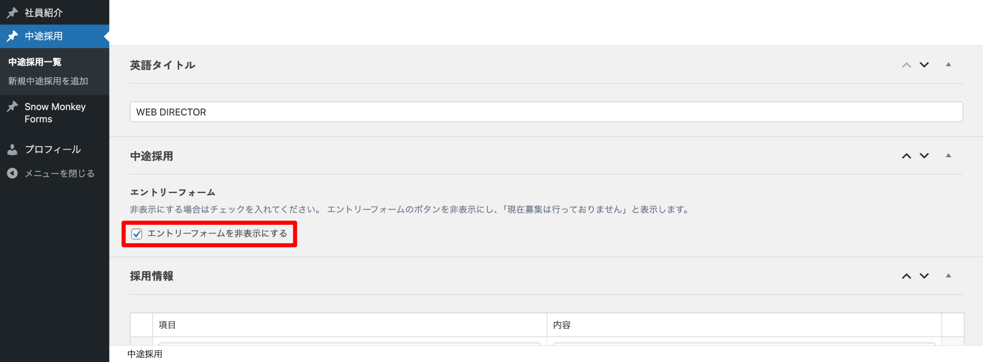表の下部にある「エントリーフォーム」ボタンは、「エントリーフォームを非表示にする」にチェックを入れると「現在募集は行っておりません」に切り替わります。