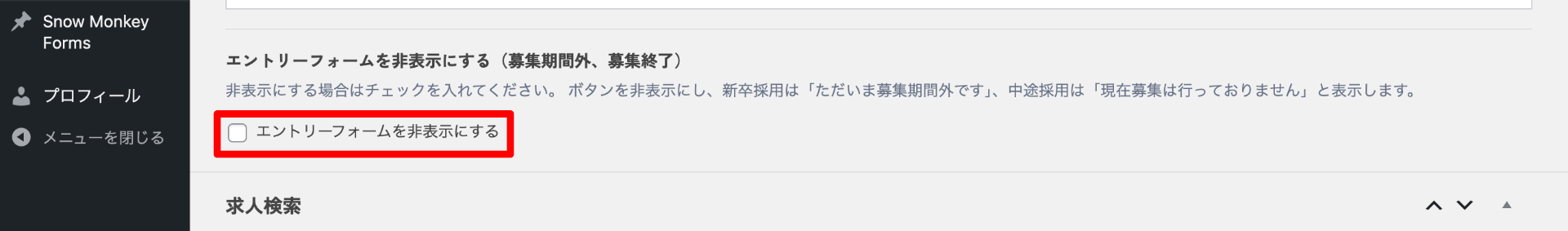表の下部にある「エントリーフォーム」ボタンは、「エントリーフォームを非表示にする」にチェックを入れると「現在募集は行っておりません」に切り替わります。
